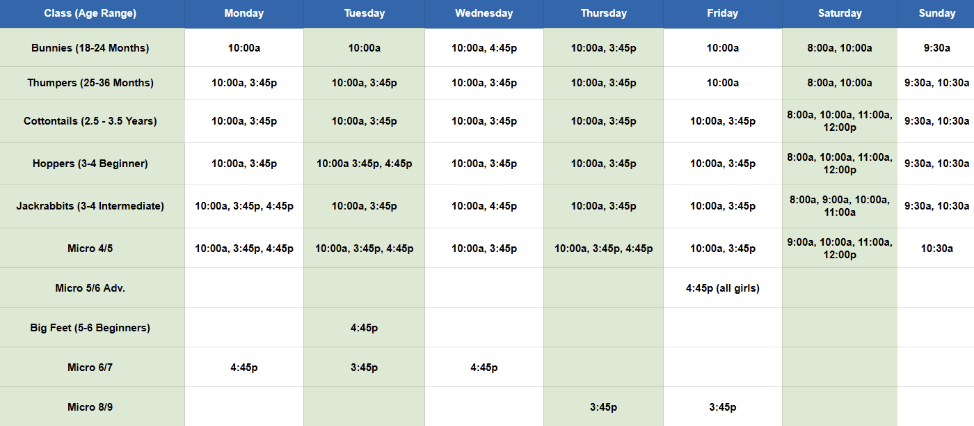 Here are our class offerings for the Winter Season 2025 - 2026. Starting December 1st - March 15th